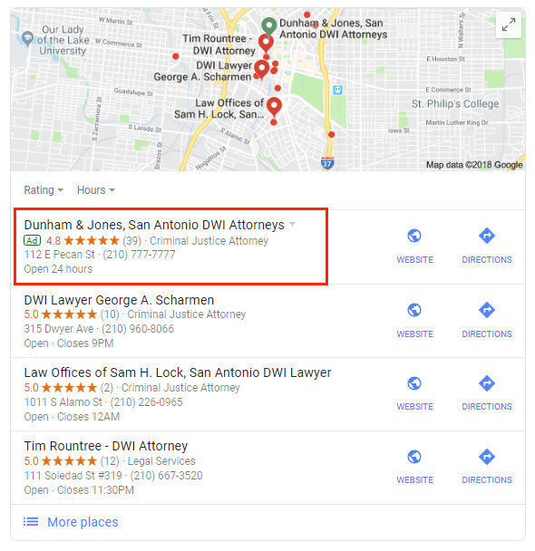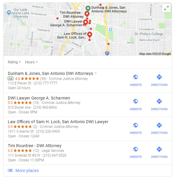 For example, a search result for “DUI lawyer in San Antonio” looks like this: