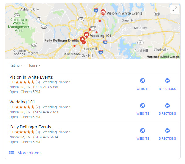 For example, if someone is searching for a “wedding planner in Nashville, Tennessee” they will see the top three results pop up from Maps. Businesses can either pay to place an advertisement on these results or build up their maps SEO to get there organically. Those three results are more likely to get clicks and customers than businesses further down on the list.